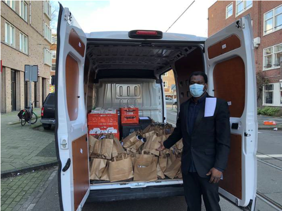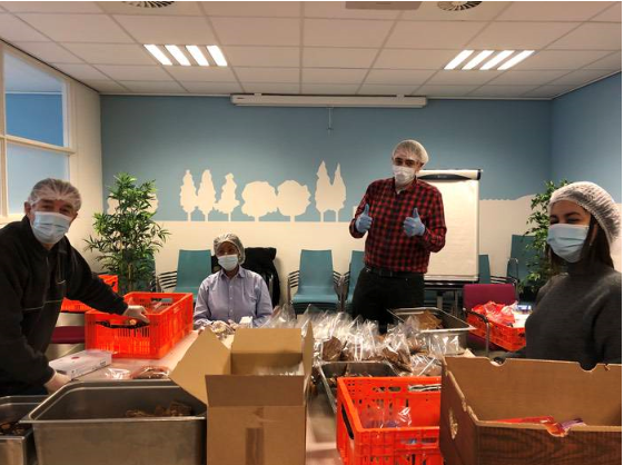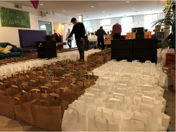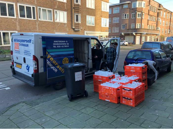 Na een week van voorbereiden, koken, goodiebags maken, routes uitwerken, alle klanten nabellen en de tomeloze inzet van vrijwilligers en stagiaires bij al die taken, liep eigenlijk alles heel soepel. De Berlage stond vol met in grote vakken gegroepeerde tasjes en maaltijddozen en dankzij een leger aan vrijwilligers waren er handen genoeg. Stipt om 11:00 uur reden de zes afgeladen bussen weg en ontving ieder keurig zijn maaltijd.